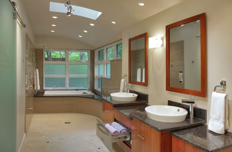 Or consider this update from Mclean, VA - where the owners opted for an open shower, raised vanity bowls, stainless towel warming drawers, and a frosted glass barn door (left foreground in image below) that artfully conceals a laundry closet.