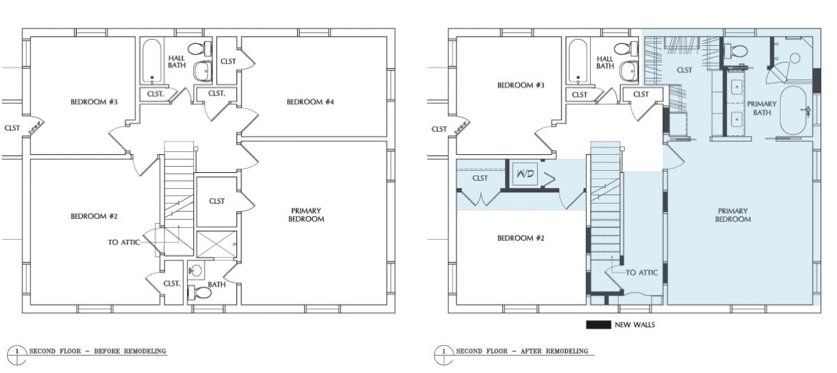 They went from a four-bedroom to a three-bedroom home but added value now and for resale by creating a much more desirable primary bathroom. We removed a staircase from one of the bedroom closets, changed the layout to create a hallway, and built a staircase there. This provided access to the attic which could be converted to a fourth bedroom in the future.
