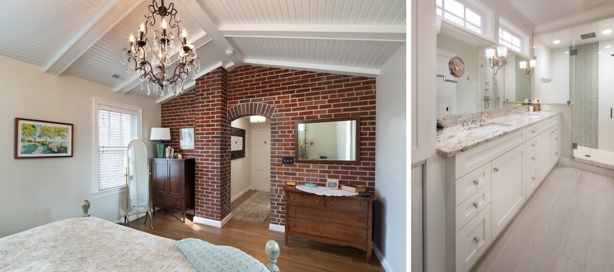 For this project, the goal was not to provide a massive primary bathroom, but to include upgraded features that would make life easier and more enjoyable. For instance, the clients wanted plenty of light, so we added windows to the space, and added a remote to open and close the transom windows located above a set of mirrors. In the bedroom, we created a vaulted ceiling with wood beams and beadboard, and exposed brick on an accent wall.