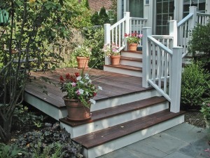 The new transitional deck is large enough for a small table and chairs while wide steps allow for spillover seating. Plantings add four-season interest and surround the space with color, texture, and movement. The deck was constructed of Ipe with a composite railing system for trouble-free maintenance.